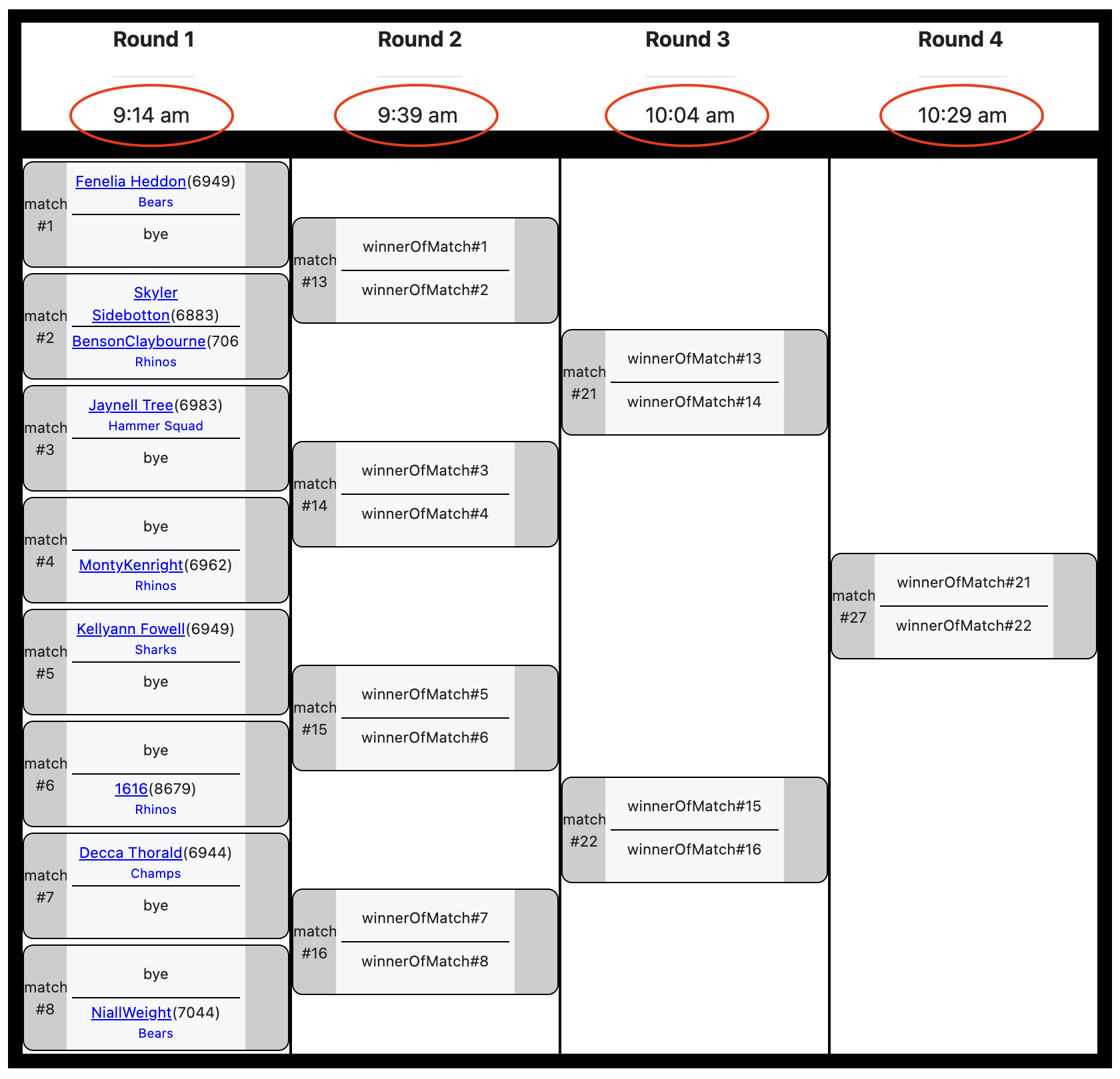 Every match will be assigned to a mat at an exact scheduled time. This time is listed on the bracket.